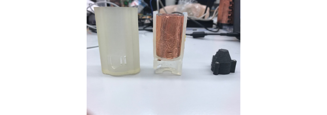 The skeleton structure (center) was created with just enough circumference to fit an eyedropper bottle. In order to determine fluid level as well as if the bottle has been squeezed, a capacitor is wrapped around the structure. The side of the structure also has openings to feed wires to the top, where it is attached to reed switches. These switches are used with the magnets on the cap (right) to determine when the cap is off. After assembling the PCBs and passing in the wires, a sleeve (left) is placed on top to protect the PCBs from environmental damage.