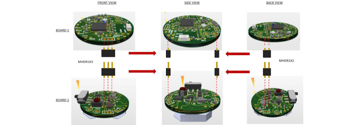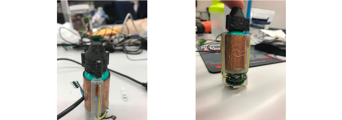 The challenge with the PCBs was dealing with the limited diameter. This led to the design decision to have two PCBs since there was not any limitation in height. The two PCBs would communicate data back and forth through header connectors that would also give the stacked structure of the PCBs.