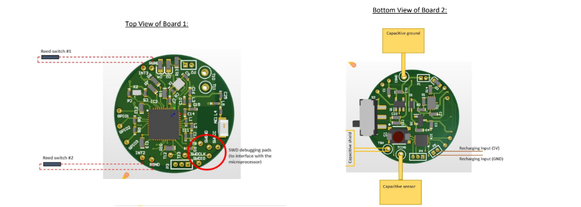 The bottom PCB contained through holes to use wires and connect the capacitor in the inner sleeve with the FDC1004 capacitance-to-digital converter. The PCB also had the BNO080 Inertial Measurement Unit (IMU) sensor, which captures any change in acceleration and tilt from the eyedropper. A secondary coin cell battery was placed behind, which powered the two PCBs. The bottom PCB also possessed logic to recharge the coin cell battery, and LEDs to display charge and connection status.