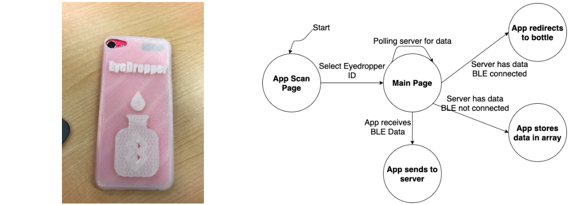Two PCBs were developed, one stacked on top of the other, and placed inside a slot below the eyedropper bottle. These PCBs contained sensors and a microcontroller which ran real-time classification algorithms to determine when the eyedropper medication was properly dispensed. Each use event was then sent as a package via BLE to a Wi-Fi capable device which parsed and redirected the packaged data to a web server for proper data logging and feedback.