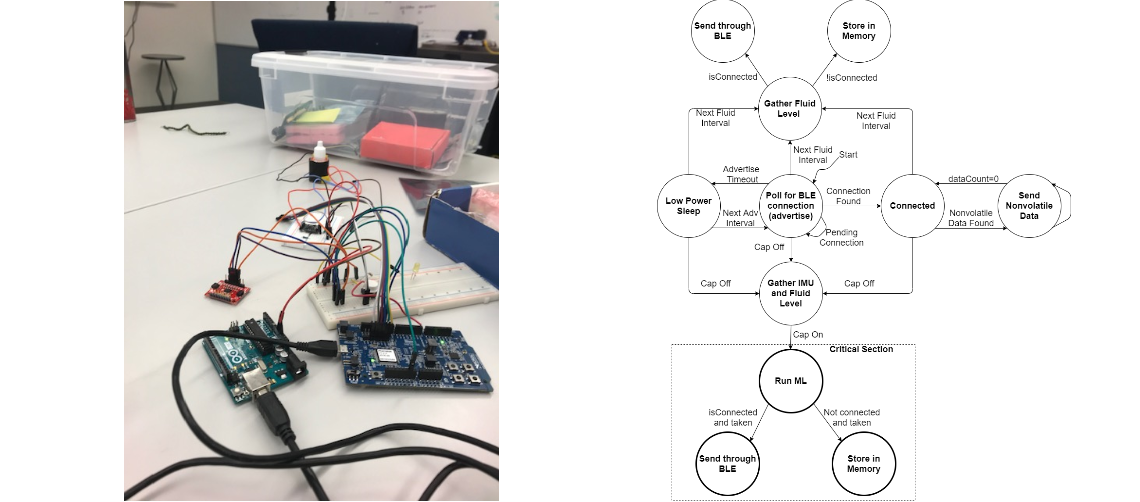 The code was developed in C using Segger Embedded Studio (official nRF supported IDE). The FreeRTOS library was used since the bottle needed to sit idle until the fluid level and connection status needed to be checked at given intervals. FreeRTOS helped to use the low power timer to wake up the bottle when it was time for an event, thus saving on CPU execution.
