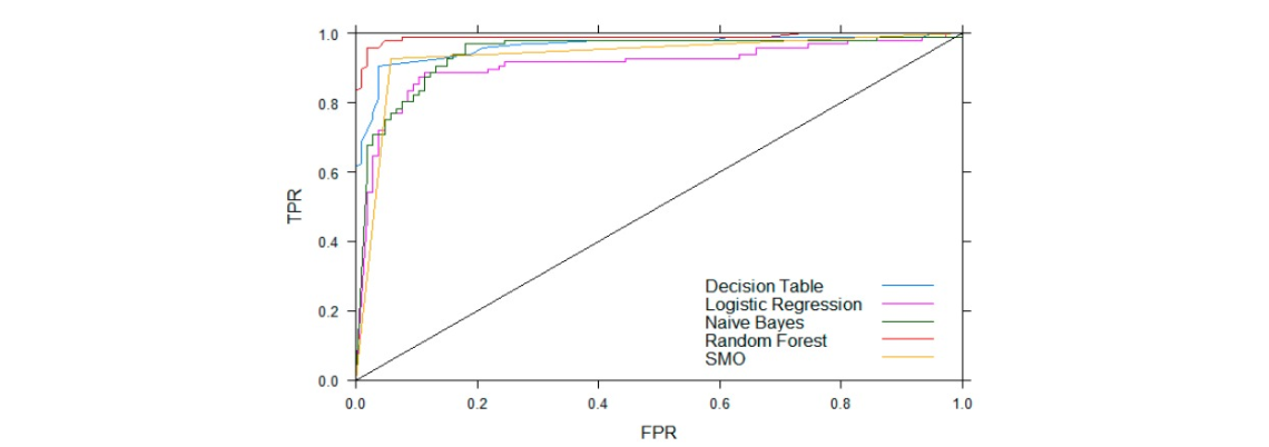 which compares the True Positive Rate (TPR) vs False Positive Rate (FPR) shows that Random Forest was the most optimal algorithm.
